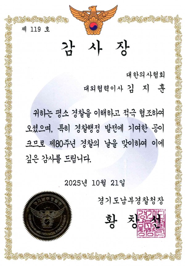 본 원 김지훈 원장(대한의사협회 대외협력이사)이 2025년 10월 21일 개최된 ‘제80주년 경찰의 날’ 행사에서 ‘경기도남부경찰청장’으로부터 감사장을 수여 받았습니다.